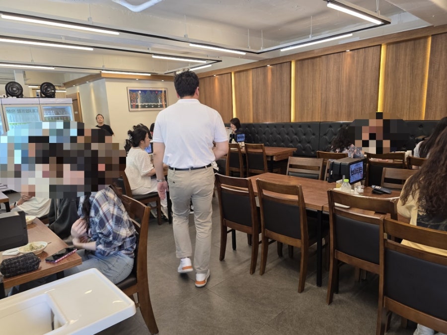 손님들로 북적이는 식당 내부의 활기찬 모습입니다. 깔끔하고 넓은 공간에서 편안하게 식사를 즐길 수 있었어요.