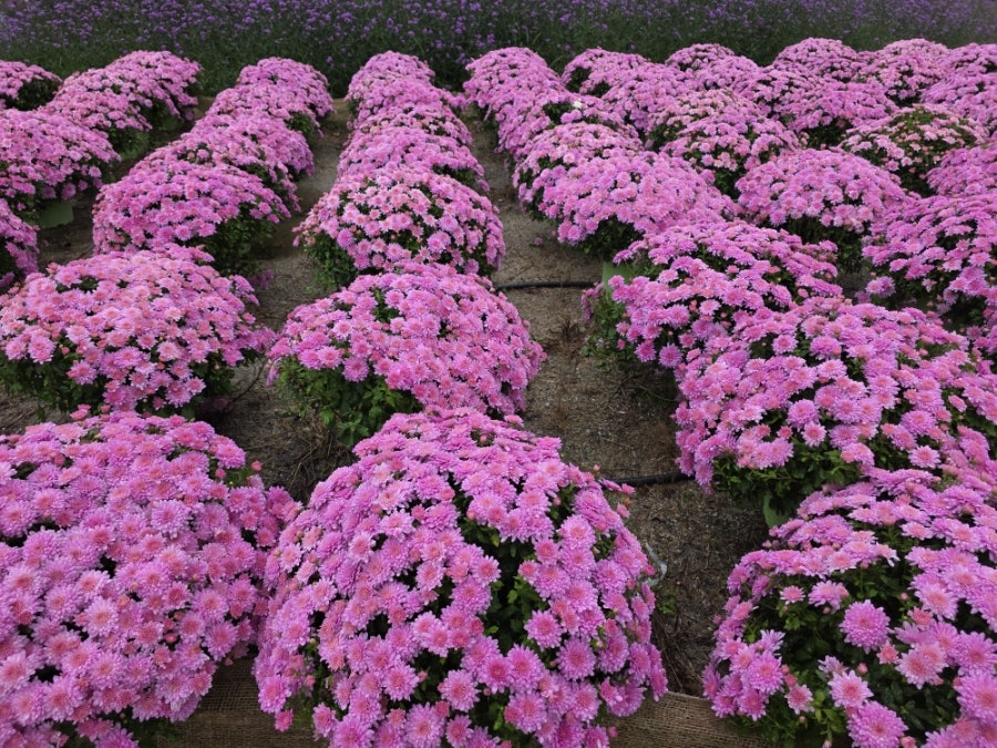 강렬한 자주색 국화가 빽빽하게 피어있었어요. 빗속에서도 선명한 색감이 돋보였어요.