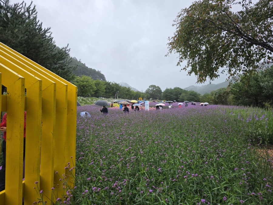 보라색 버베나 꽃밭과 노란색 오두막집이 어우러져 아름다운 풍경을 만들어냈어요. 비 오는 날의 운치를 제대로 느꼈어요.