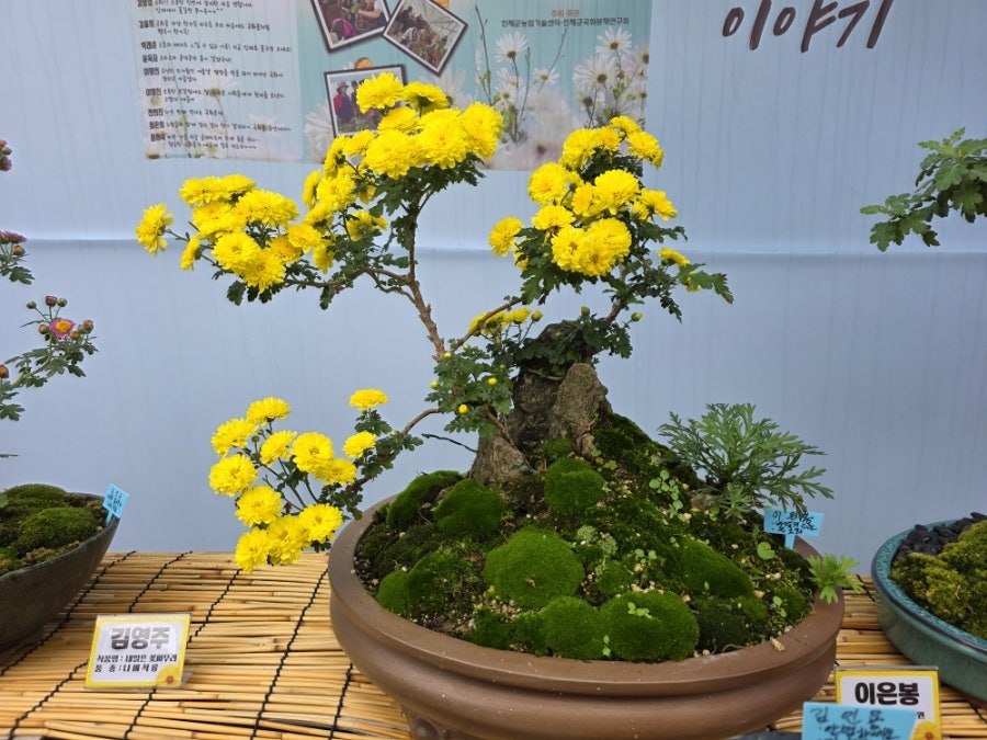 전시된 노란 국화 분재가 정말 아름다웠어요. 빗방울을 맞아 더 싱그러워 보였어요.
