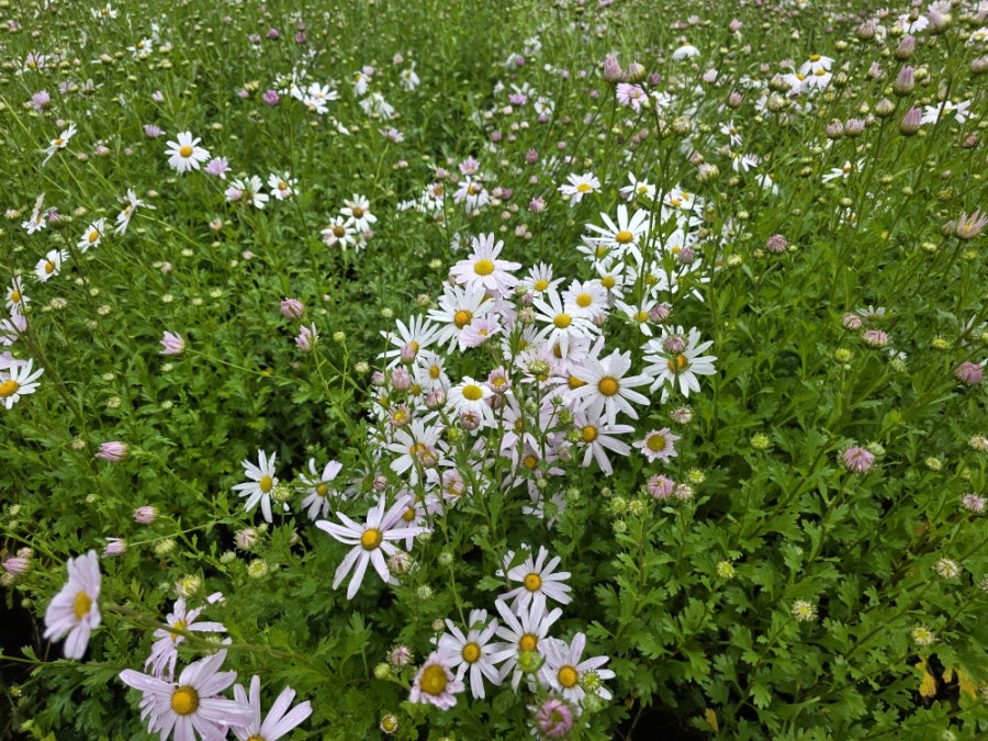 드넓은 들판에 하얗고 분홍빛 들국화가 가득 피어있었어요. 빗물을 머금은 모습이 청초했어요.