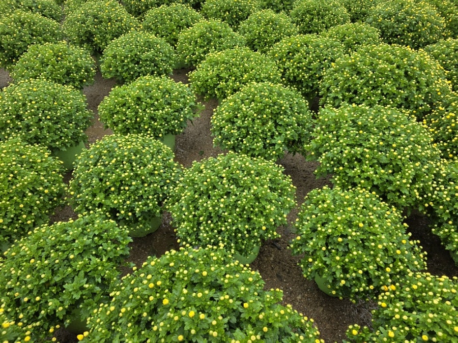 아직 활짝 피지 않은 노란 국화 꽃봉오리가 귀여웠어요. 곧 만개할 꽃들이 기대됐어요.