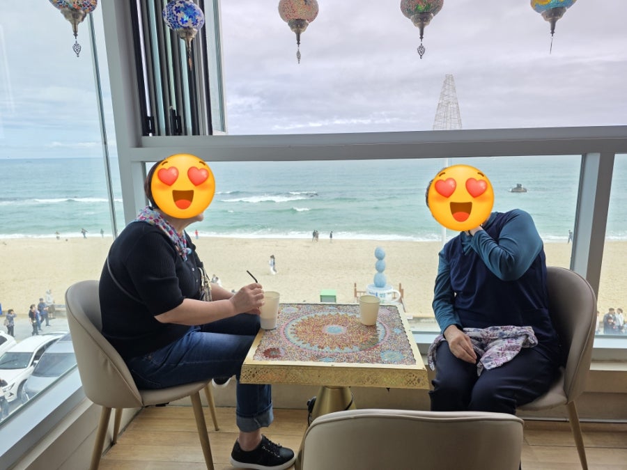 우리그녀와 친구는 3층 창가 테이블에 앉아 커피를 마시고 있네요. 통유리창으로 보이는 안목해변의 풍경이 정말 아름다웠어요. 커피를 마시며 이야기를 나누고, 시원한 바다를 바라보니 여행의 피로가 싹 풀리는 기분이라고 하네요. 바다와 함께 즐기는 커피 한 잔, 정말 최고였어요.