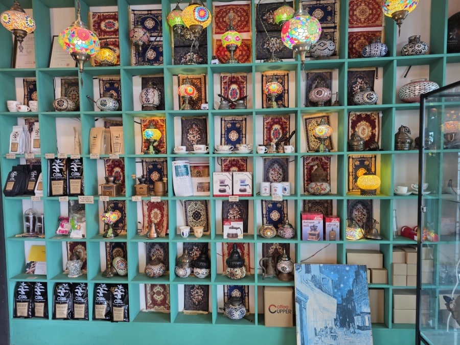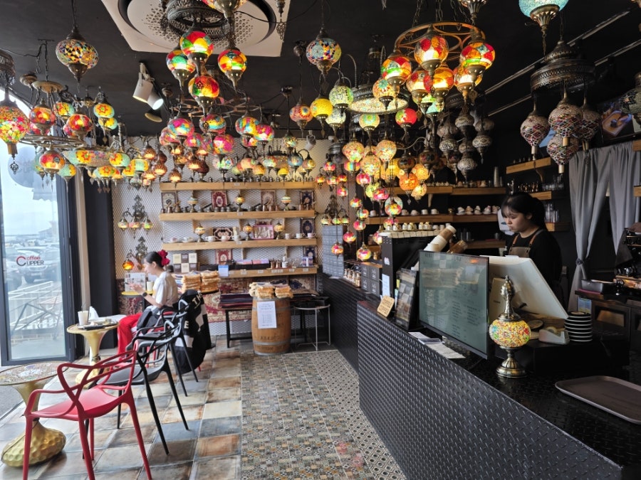 카페에 들어서니 화려한 터키풍 램프들이 천장에 가득했어요. 다양한 색깔과 모양의 램프들이 이국적인 분위기를 만들어냈어요. 마치 터키의 어느 시장에 온 것 같았어요. 예쁜 램프들 아래에서 커피를 마시니 특별한 경험이었어요.