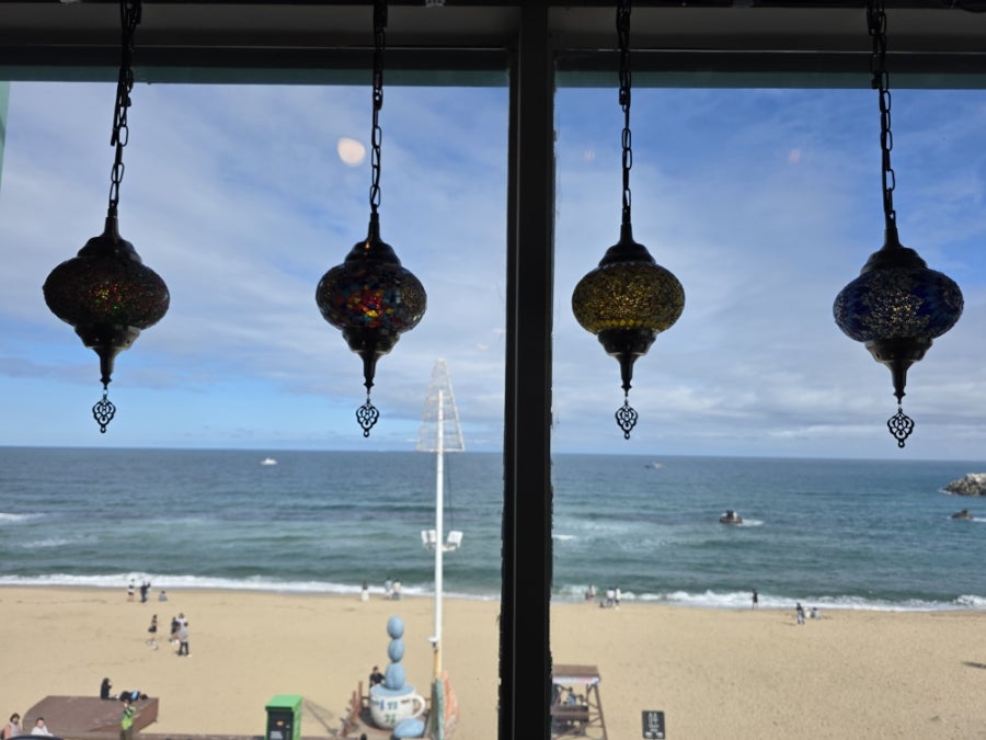 카페 창문 너머로 보이는 안목해변이에요. 맑은 날씨는 아니었지만, 잔잔한 파도와 넓은 모래사장이 잘 어우러져서 아름다운 풍경을 만들어냈어요.