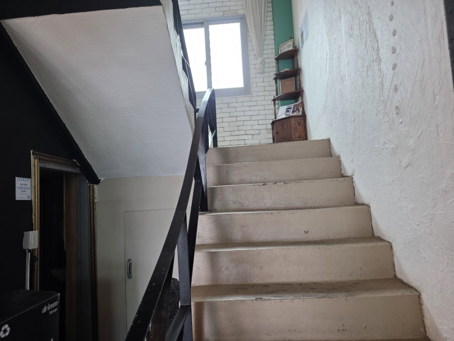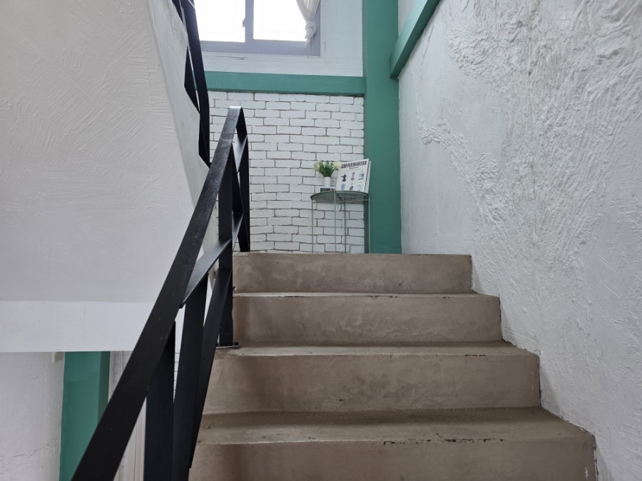 카페는 층마다 다른 분위기를 가지고 있었어요. 1층에서 2층으로 올라가는 계단은 심플하면서도 깔끔한 느낌이었어요. 새로운 공간을 기대하며 한 계단씩 올라갔어요.