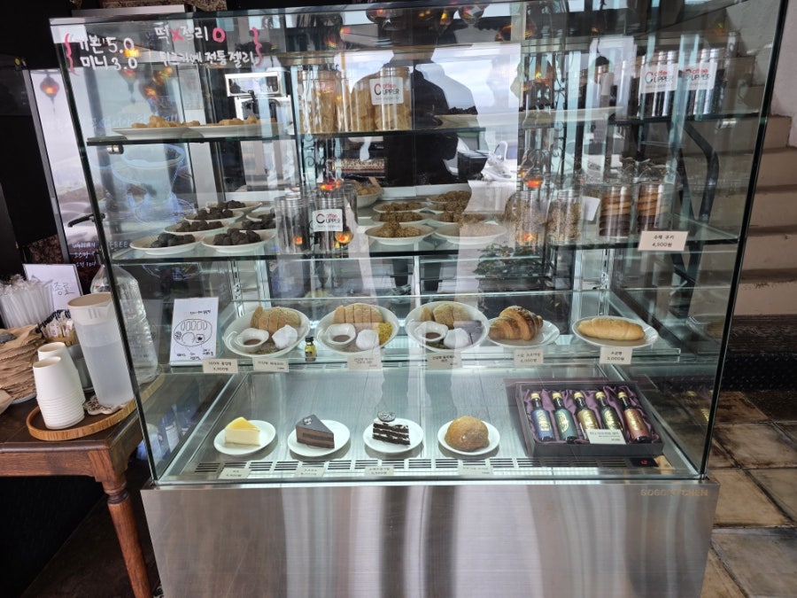 커피와 함께 즐길 수 있는 디저트들도 다양하게 준비되어 있었어요. 케이크, 크루아상, 빵 등 달콤한 디저트들이 진열되어 있었는데, 커피와 함께 맛보면 좋을 것 같아서 고민했어요.