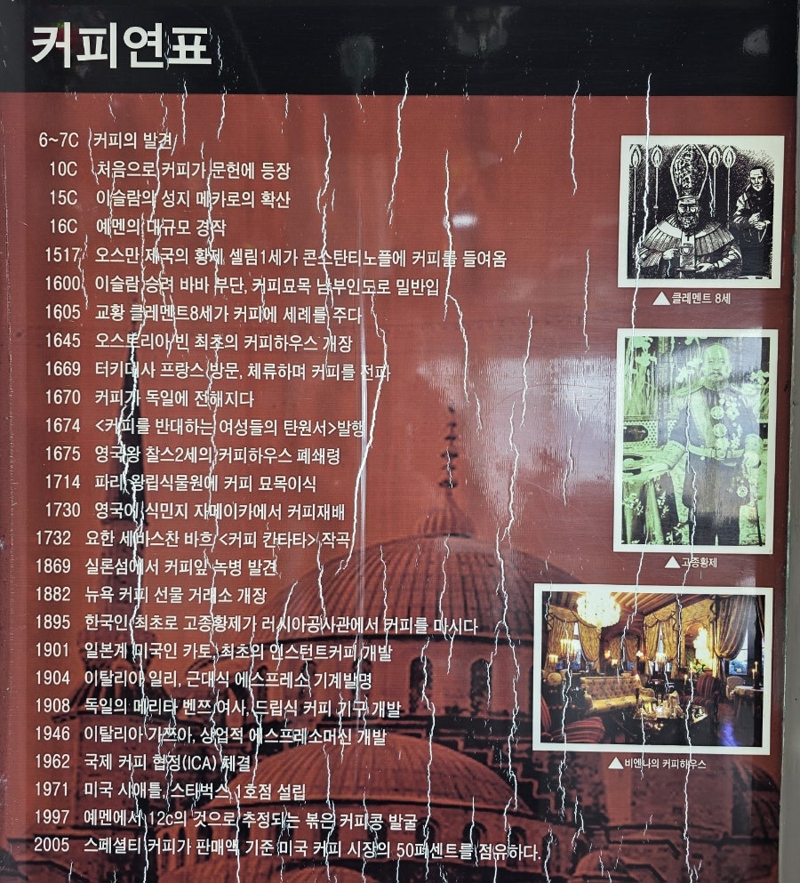 커피의 역사를 한눈에 볼 수 있는 연표도 있었어요. 커피의 탄생부터 한국에 들어온 역사까지 자세하게 설명되어 있어서 흥미로웠어요.