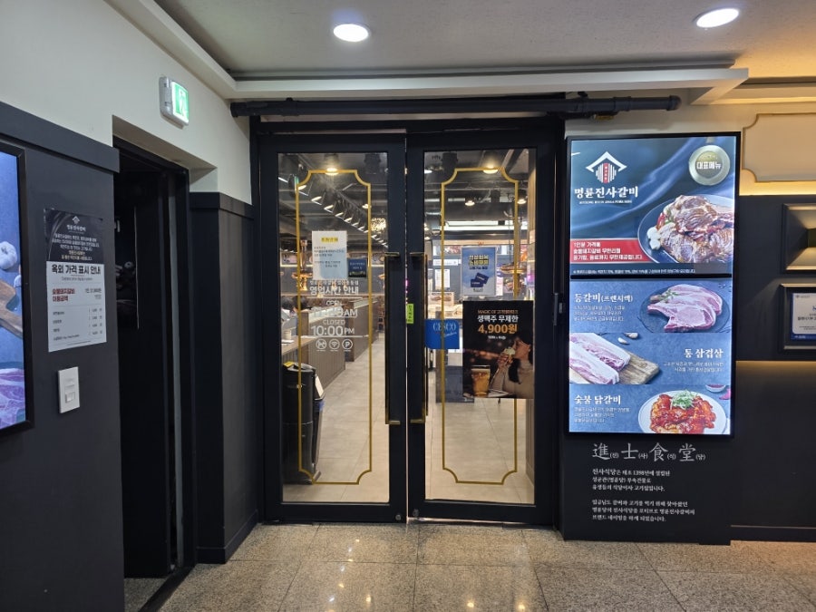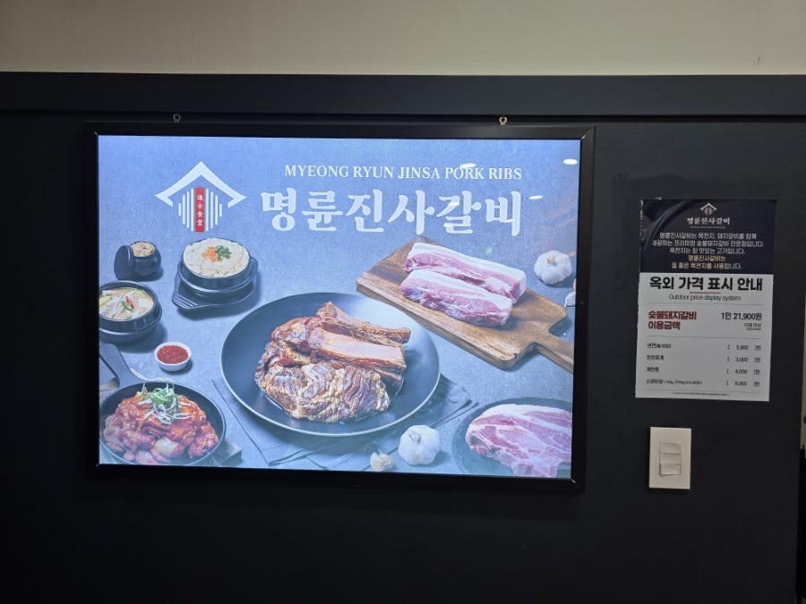 매장 입구에는 명륜진사갈비의 인기 메뉴들이 보기 좋게 소개되어 있어요. 특히 등갈비 프렌치렉, 통삼겹살 등 숯불에 구워 먹으면 더욱 맛있는 고기들이 발길을 멈추게 합니다. '착한프랜차이즈' 명륜진사갈비의 맛있는 고기를 맛볼 시간이네요!