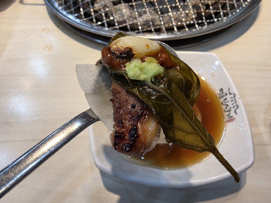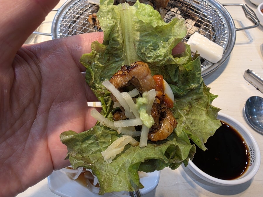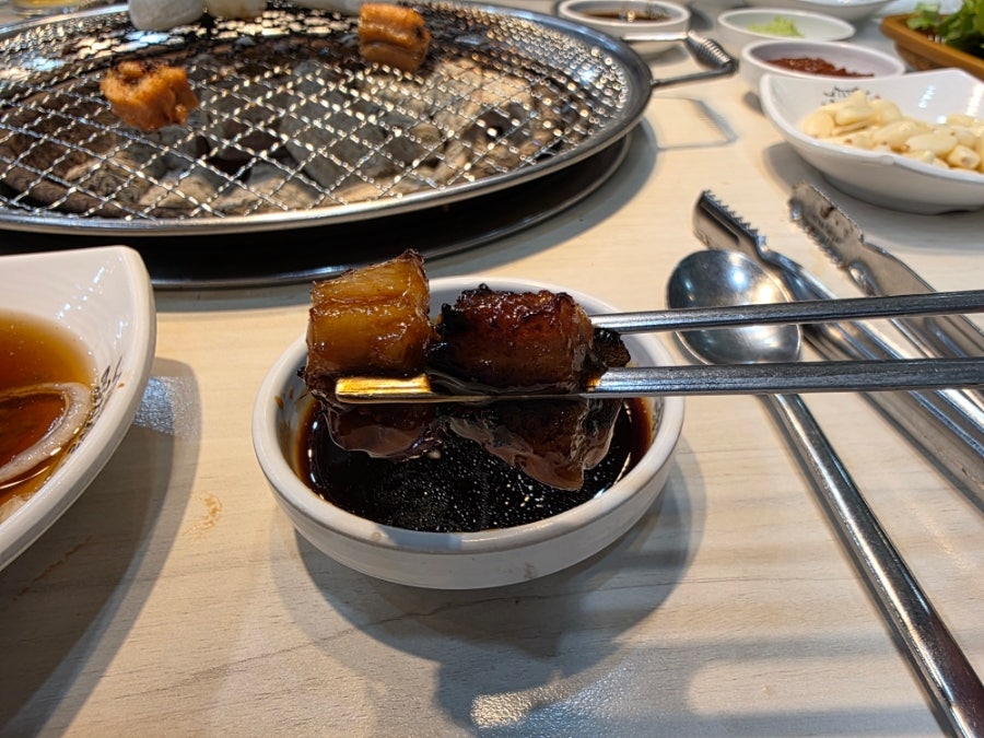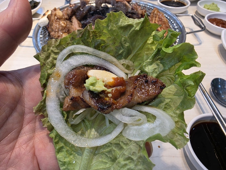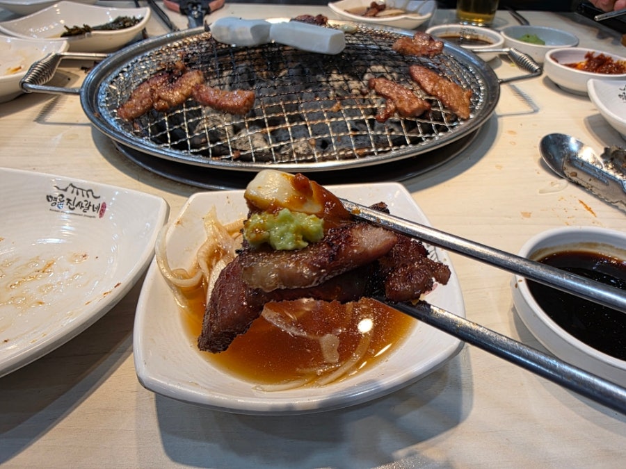 숯불에 잘 구워진 고기 한 점을 무쌈과 깻잎에 올리고, 와사비와 마늘을 더해 먹으니 입안 가득 감칠맛이 폭발했어요. 고기 맛을 더욱 풍부하게 만들어주는 조합이었답니다.