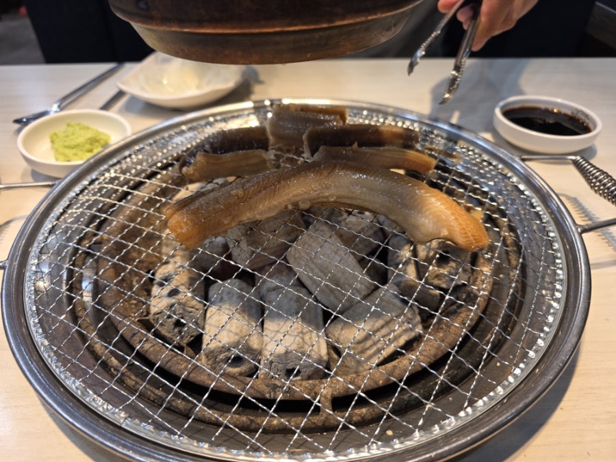 숯불에 맛있게 구워진 장어의 모습이에요. 바삭한 껍질과 부드러운 속살의 조화가 완벽했어요. 그냥 먹어도 맛있고, 쌈 채소나 다른 곁들임 메뉴와 함께 먹으면 더욱 맛있었답니다.