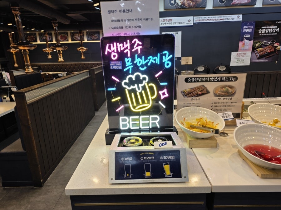 고기와 환상의 궁합을 자랑하는 생맥주! 이곳은 '한 잔 가격'으로 시원한 생맥주를 무제한으로 즐길 수 있는 특별한 이벤트가 있었어요. 숯불에 구운 고기와 시원한 맥주 한 모금은 정말 잊을 수 없는 조합이었답니다.