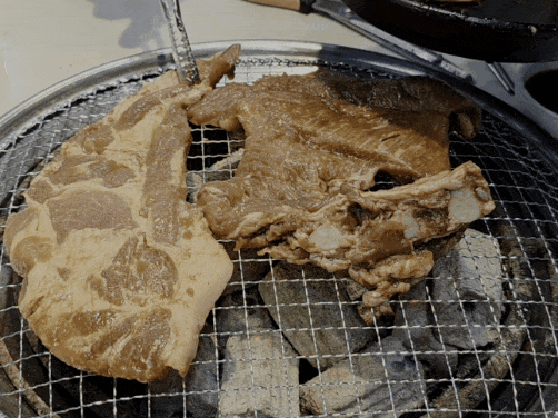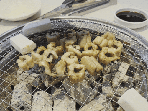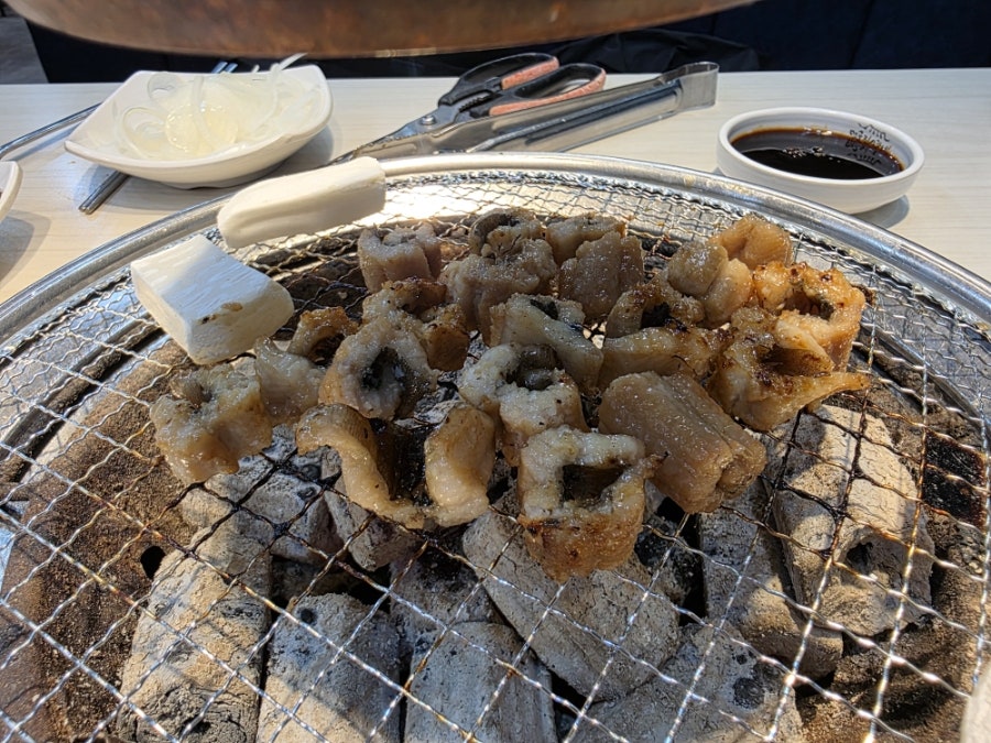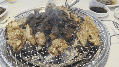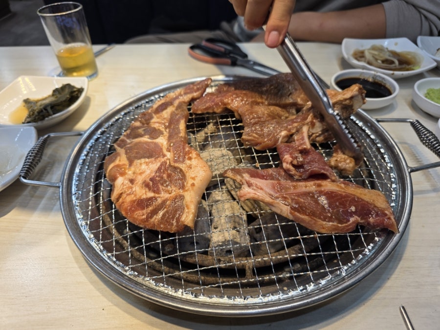 숯불 위에서 맛있게 익어가는 고기들을 보니 흐뭇했어요. 고기 종류가 다양해서 질릴 틈이 없었답니다. 배가 터질 때까지 맛있게 즐길 수 있는 '가성비' 좋은 맛집이었어요. 테이블 환풍기 그늘에 가려져 마치 고기가 탄 듯 보이는데, 그렇지 않아요.