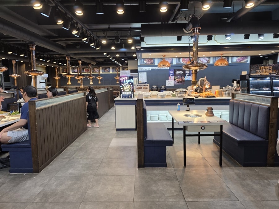 넓고 쾌적한 매장 내부는 가족 외식, 친구들과의 모임 장소로도 손색이 없어요. 깔끔하게 정돈된 테이블과 먹음직스러운 샐러드바가 한눈에 들어옵니다. '자유이용'으로 다양한 고기와 음식을 마음껏 즐길 수 있는 곳이죠!