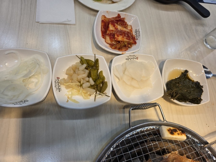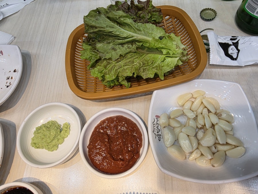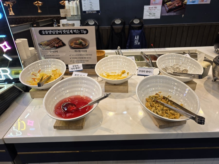 테이블 위에 차려진 다양한 밑반찬들이 고기 맛을 한층 더 살려줬어요. 아삭한 무쌈, 매콤한 김치, 그리고 쌈 채소 등 취향에 따라 골라 먹는 재미가 있었어요. 샐러드바에서 자유롭게 가져다 먹을 수 있어서 좋았답니다.