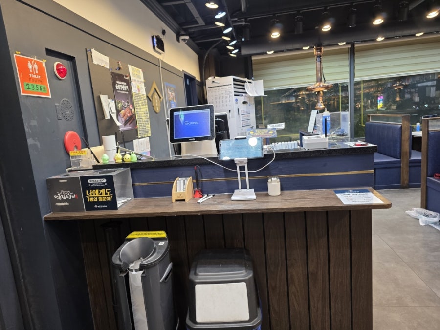 맛있게 식사를 마치고 계산하는 곳입니다. 깔끔하게 정리된 계산대와 함께 친절한 직원들의 응대가 돋보여요. 가맹점주와 상생하고 자립준비청년들을 후원하는 '착한프랜차이즈' 명륜진사갈비에서 행복한 식사를 마무리했습니다.