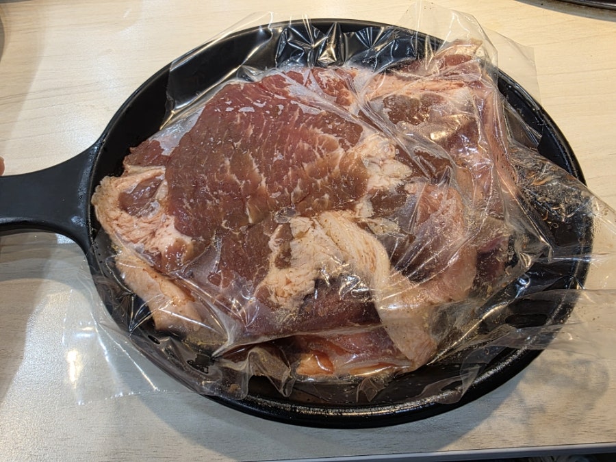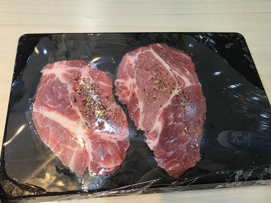 다음 메뉴로 목살을 선택했어요. 목살은 이렇게 팩으로 포장되어 있었어요. 신선하게 보관된 고기를 직접 가져다 먹을 수 있어서 좋았답니다.
