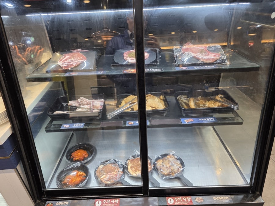이곳의 하이라이트는 바로 고기 냉장고였어요. 숯불돼지갈비, 후려페퍼스테이크, 등갈비 프렌치렉, 숯불양념장어까지! 다양한 종류의 고기가 신선하게 보관되어 있었어요. 원하는 고기를 마음껏 가져다 먹을 수 있어서 행복했답니다.