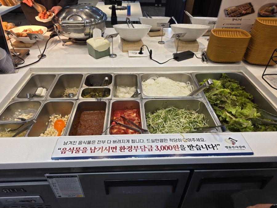 고기와 곁들여 먹을 쌈 채소와 신선한 반찬들이 깔끔하게 준비되어 있었어요. 특히 명륜진사갈비는 남은 음식물을 남기면 환경부담금을 내는 '착한 시스템'이 있어서, 먹을 만큼만 적당히 담아갈 수 있어 좋았어요. 음식물 쓰레기를 줄이려는 노력까지 하는 착한 프랜차이즈라는 점이 인상 깊었답니다.
