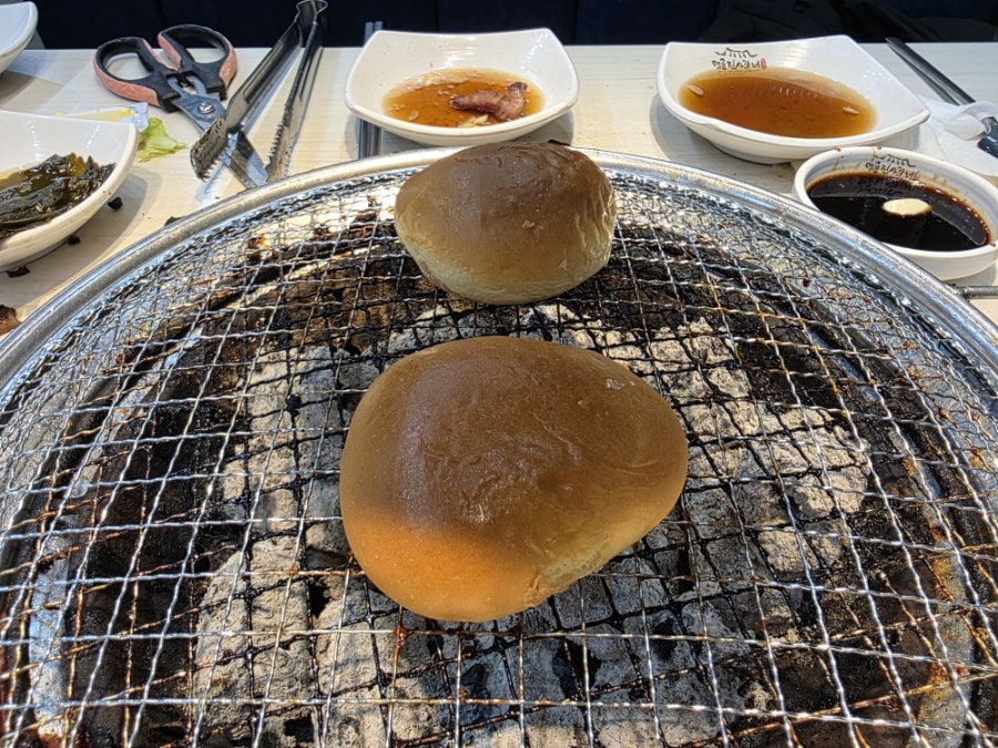 고기만 먹는 게 아니었어요! 샐러드바에 있는 모닝빵을 가져와서 숯불에 살짝 구워 먹었는데, 겉은 바삭하고 속은 부드러워서 정말 맛있었답니다. 고기와 함께 먹으니 환상의 조합이었어요.