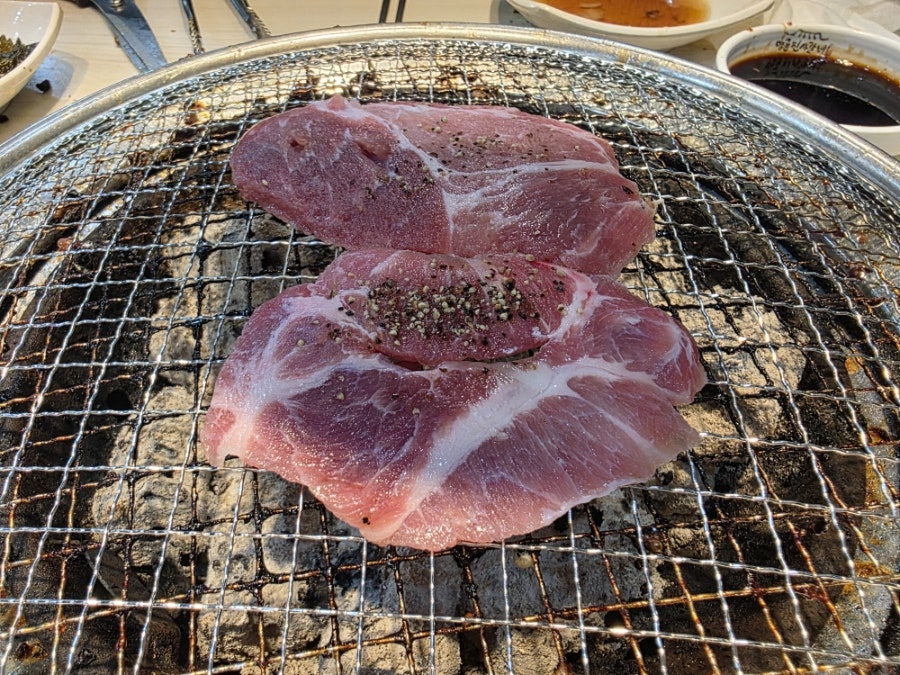 두툼한 목살위에 후추가 듬뿍 뿌려져 있었어요. 숯불에 구우니 고소한 냄새가 코를 찔렀답니다. 육즙이 살아있어서 정말 맛있었어요.