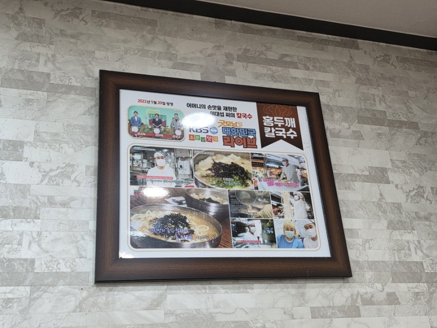 KBS '생생정보' 등 다양한 매체에 소개되었던 흔적이 벽면에 걸려 있습니다. 특히 '어머니의 손맛을 재현한 이대섭 씨의 칼국수'라는 문구에서 장인 정신과 맛에 대한 자부심이 느껴지네요. 방송 출연으로 더욱 유명세를 탄 곳이지만, 초심을 잃지 않고 착한 가격과 맛을 유지하고 있어 더욱 박수를 보냅니다.
