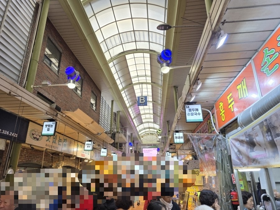 시장통의 정겨운 분위기 속, 수많은 인파 속에서도 눈에 띄는 큼지막한 간판이 인상적이죠. 투명하게 오픈된 주방 너머로 분주하게 움직이는 손길들이 벌써부터 맛에 대한 기대감을 높여줍니다. 시장 구경의 재미를 더해주는 필수 코스랍니다.