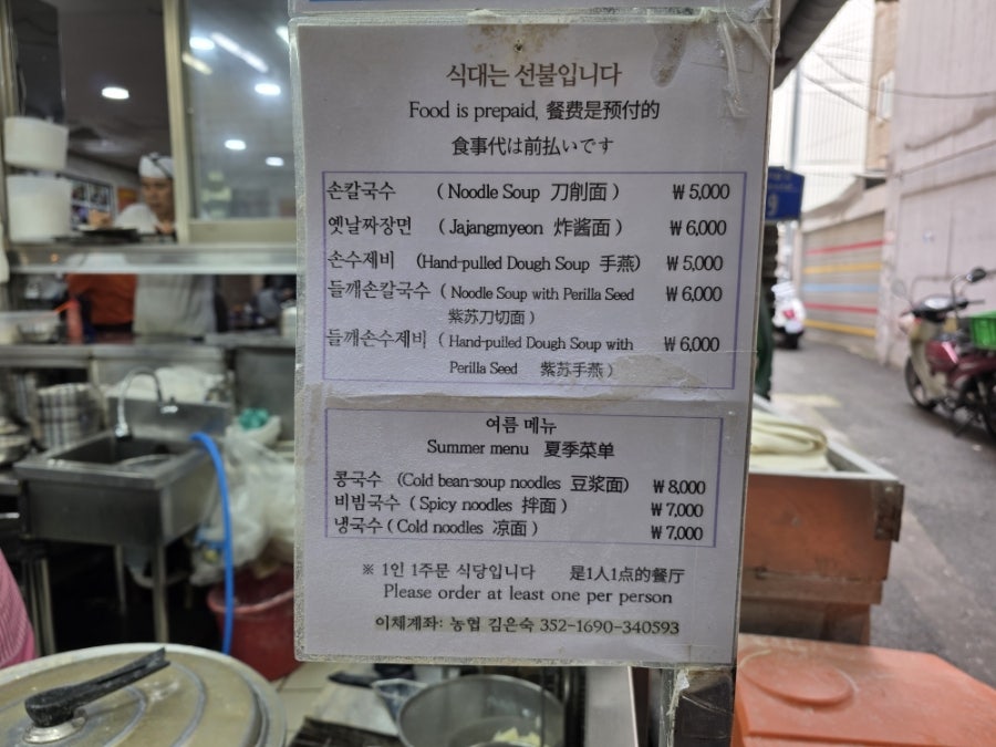 손칼국수와 손수제비가 단돈 5,000원! 들깨가 들어간 메뉴도 6,000원, 옛날 손짜장도 6,000원이라니, 요즘 물가에 이 가격이 실화인가요? 여름 한정 메뉴로 콩국수, 냉국수, 비빔국수도 준비되어 있습니다. 식대는 선불이며, 물과 김치는 셀프! 착한 가격을 유지하는 비결이겠죠. 참고로 곱빼기는 1,000원이 추가됩니다.