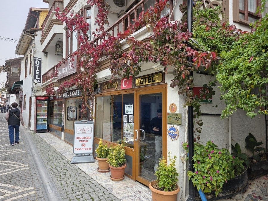 아마시아의 거리 풍경이에요. 고풍스러운 건물 외벽을 타고 붉게 물든 담쟁이덩굴이 내려오고, 그 아래로 아담한 상점과 호텔이 자리하고 있어요. 이곳 세마이 호텔 & 카페(Semay Otel & Cafe) 주변은 특히 예쁜 식물들로 잘 가꾸어져 있어 눈이 즐거웠어요. 터키 국기가 살짝 보이는 곳에서 현지의 활기찬 일상을 엿보았답니다.