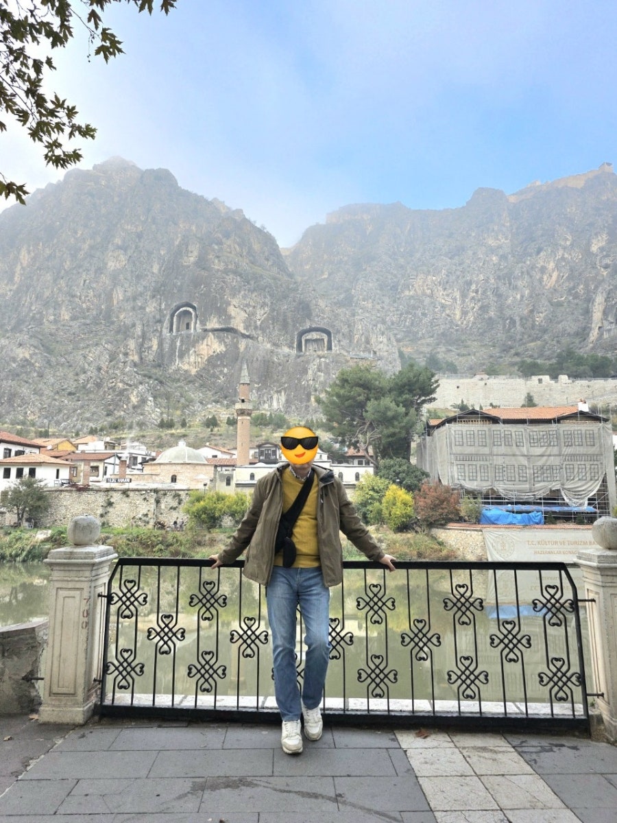 예실으르막 강을 가로지르는 목조 다리 위에서 신나는 모습으로 브이! 아마시아의 고즈넉한 옛집들이 강변을 따라 줄지어 서 있는 모습이 정말 아름다웠어요. 여행지에서의 행복한 기분을 두 손 높이 들어 표현했답니다. 고대와 현대, 자연과 역사가 어우러진 아마시아는 사랑할 수밖에 없는 도시였어요!