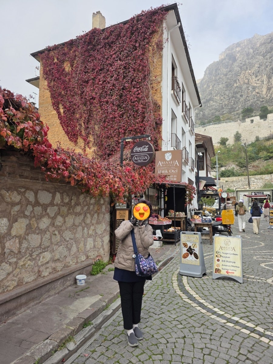 화사한 붉은 잎으로 덮인 건물이 눈길을 사로잡았어요. 마치 건물이 가을 옷을 입은 듯하네요! 이 건물 앞에는 아마시아 특산품을 파는 부티크 오텔과 상점이 함께 있었어요. 돌담을 배경으로 예쁜 가을 햇살을 받으며 단독 사진을 남겼어요. 뒤쪽으로는 여전히 웅장한 바위산이 든든하게 받쳐주고 있어요.