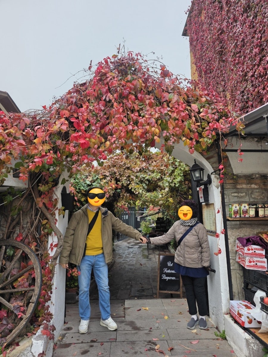 붉은 단풍잎 아치 아래에서 다정하게 한 컷! 알록달록한 잎들이 가을 분위기를 물씬 풍기며 로맨틱한 배경을 만들어주었어요. 여행의 설렘과 즐거움을 가득 담아 서로 손을 잡고 사진을 찍었답니다. 아마시아의 길목마다 이런 예쁜 포토존들이 숨어있어 카메라 셔터를 멈출 수가 없었어요. 잊지 못할 추억을 또 하나 만들었어요!