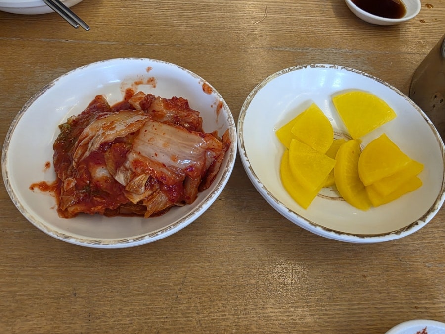 식당에 가면 가장 먼저 마주하는 게 반찬이죠? 본정손만두의 김치와 단무지는 아주 정갈하게 담겨 나와요. 특히 저 아삭한 김치는 적당히 매콤해서 담백한 만둣국과 환상의 궁합을 자랑한답니다. 노란 단무지도 새콤달콤해서 중간중간 입가심하기에 딱 좋았어요. 반찬이 깔끔한 걸 보니 메인 메뉴에 대한 기대감이 한층 더 올라갔답니다.