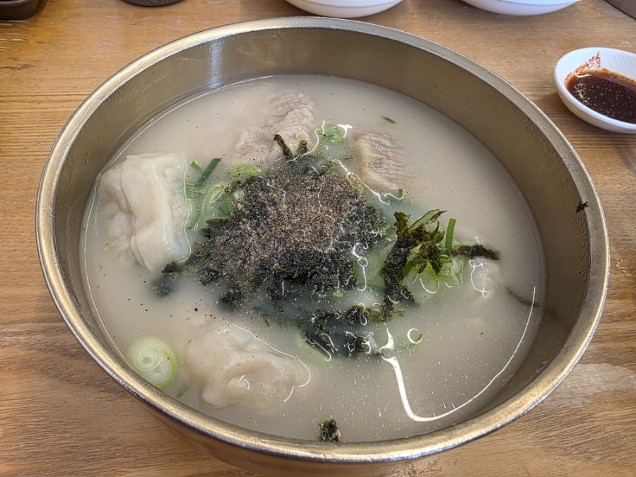 오늘의 주인공인 사골만둣국이에요! 뽀얗고 진한 국물 색이 마치 보약처럼 보이지 않나요? 국물을 한 입 먹어보니 깊고 구수한 사골의 풍미가 온몸으로 전해지더라고요. 고소한 김 가루와 깨가 듬뿍 올라가서 풍미를 더해주고, 속이 꽉 찬 손만두가 넉넉히 들어있어 다 먹고 나니 정말 배가 든든했어요. 오늘같이 추운 날씨에 이보다 더 좋은 메뉴는 없을 것 같아요.