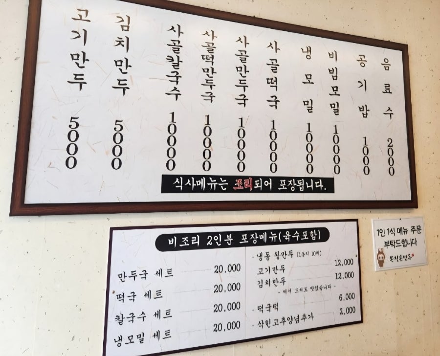 벽에 걸린 메뉴판을 보니 만두 전문점답게 구성이 아주 알찼어요. 고기만두와 김치만두가 5,000원으로 가격도 정말 착하더라고요. 사골을 베이스로 한 만둣국과 칼국수, 그리고 별미인 냉모밀까지 준비되어 있어 골라 먹는 재미가 있었어요. 2인분 이상은 비조리로 포장도 가능하다고 하니, 다음에는 가족들을 위해 포장해 가야겠다고 생각했답니다.